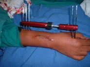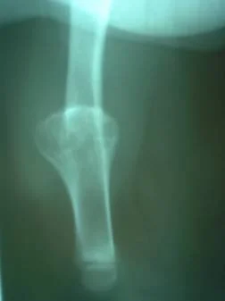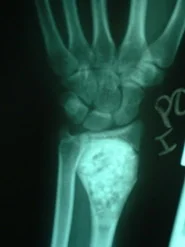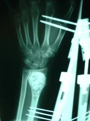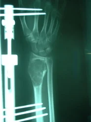 Caso Clínico: Paciente del sexo femenino de 15 años de edad, portadora de Quiste Óseo Aneurismático de radio derecho, quien había sido intervenida hace aproximadamente 1 año en otro centro, donde le practicaron curetaje de la lesión y relleno del quiste con injerto de cresta ilíaca. La lesión recidiva, acude por la consulta del Dr. Alberto A. Martínez Conde, donde previa revisión de las laminas histológicas por parte del Dr. David Mota, se practicó curetaje amplio del quiste y relleno de la cavidad con Hidroxiapatita sintética e injerto de cresta ilíaca, se estabilizo el radio con tutor externo.